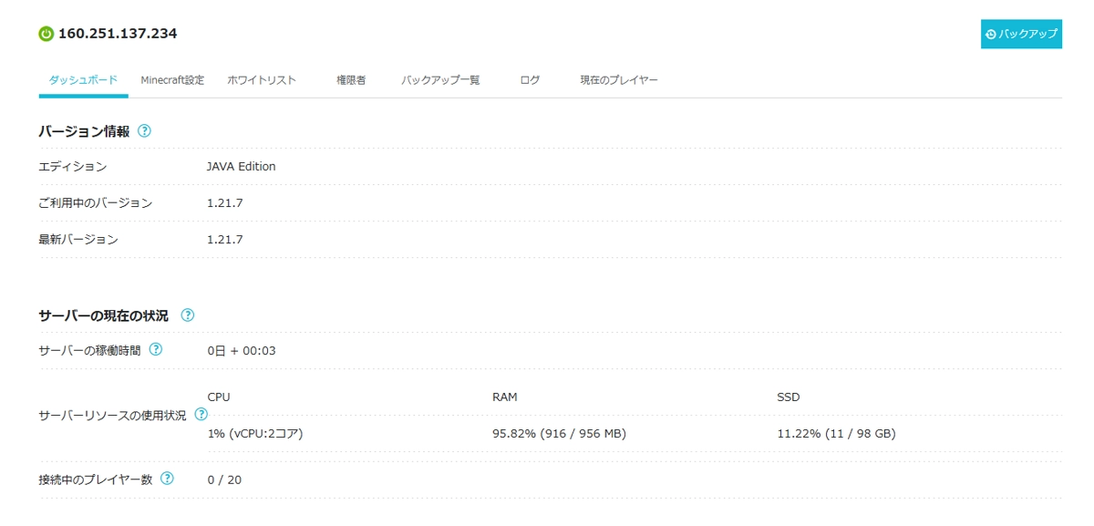 マインクラフトのバージョンや、稼働時間などを一覧で見ることができます。