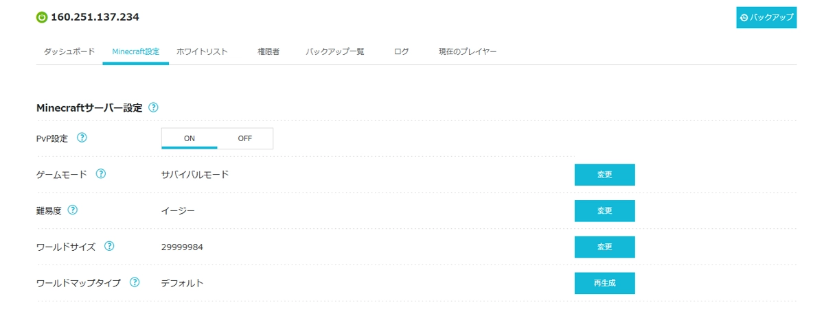 PvPの設定であったり、ゲームモードの変更ができたりします。