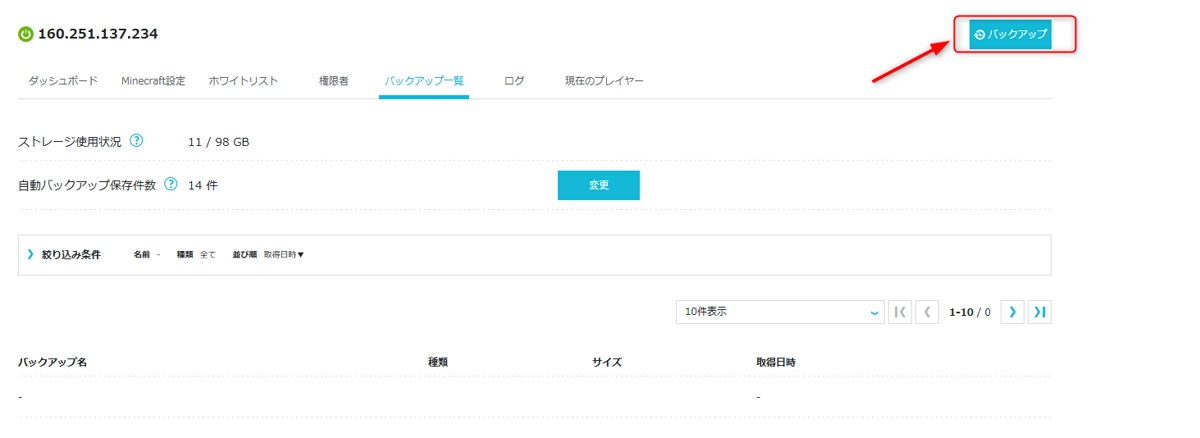 右上にあるバックアップボタンを押して名前をつけるだけで、簡単にバックアップを取得可能。