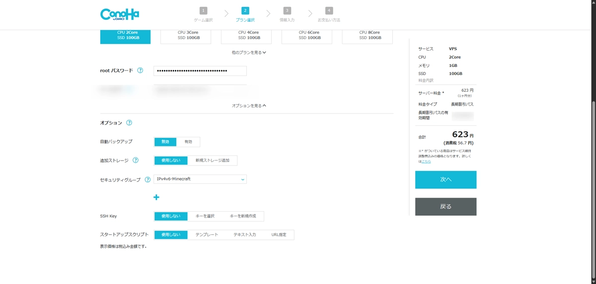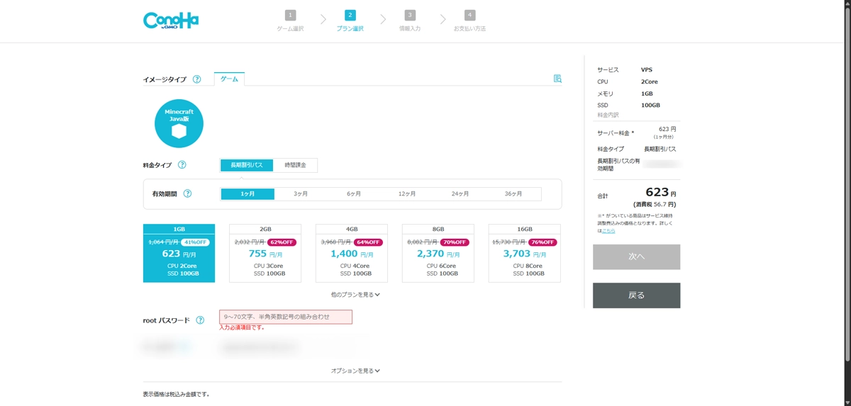 そして、マイクラサーバーのスペックを選択します。