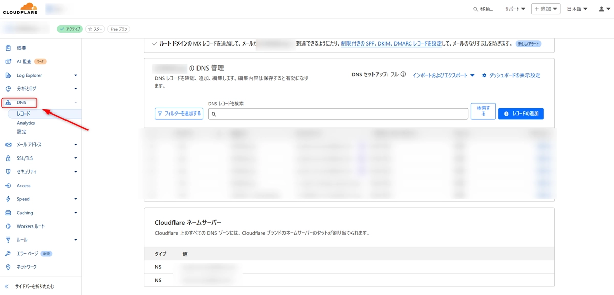 Cloudflare Registrarで購入した場合には、サイドバーのDNSをクリックすると開けますよ。