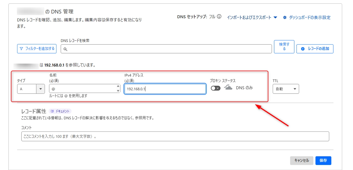 マイクラサーバーで必要なのは「Aレコード」で、ここにサーバーのグローバルIPアドレスを登録します。