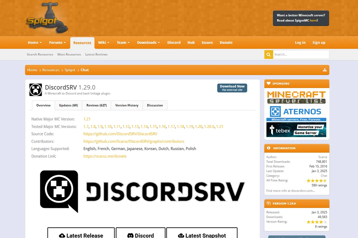 まずは、DiscordSRVのプラグイン本体をダウンロードします。