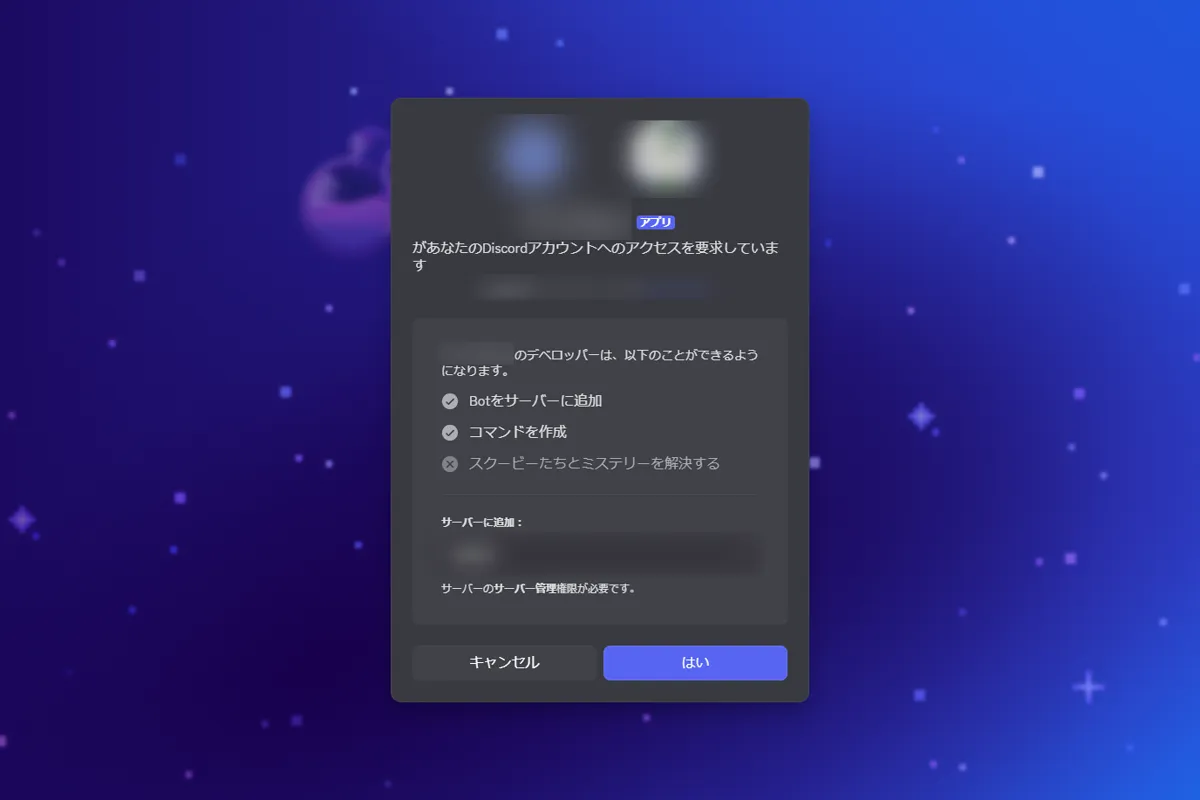 サーバーにBotを入れるには、あなたがそのDiscordサーバーの「サーバー管理」権限を持っている必要があります。