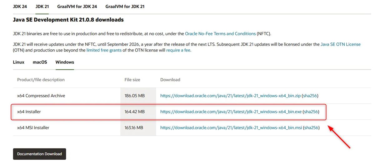 「Oracle JDK 21」のページで、「Windows x64 Installer」を選択してください。