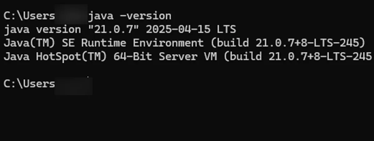 「java version “21.0.x”」のような表示が出れば、インストール成功です。