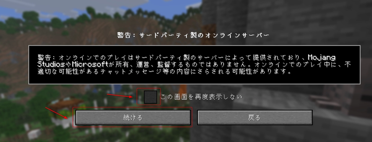 長々と確認画面が出てきます。要するに「マイクラの会社は見てないから自己責任な」ってことです。