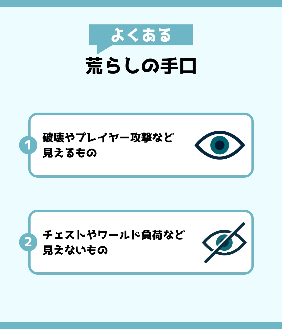 PvP(プレイヤー対プレイヤーの戦闘)が禁止のサーバーで、一方的に他プレイヤーを攻撃する行為も荒らしと見なされます。