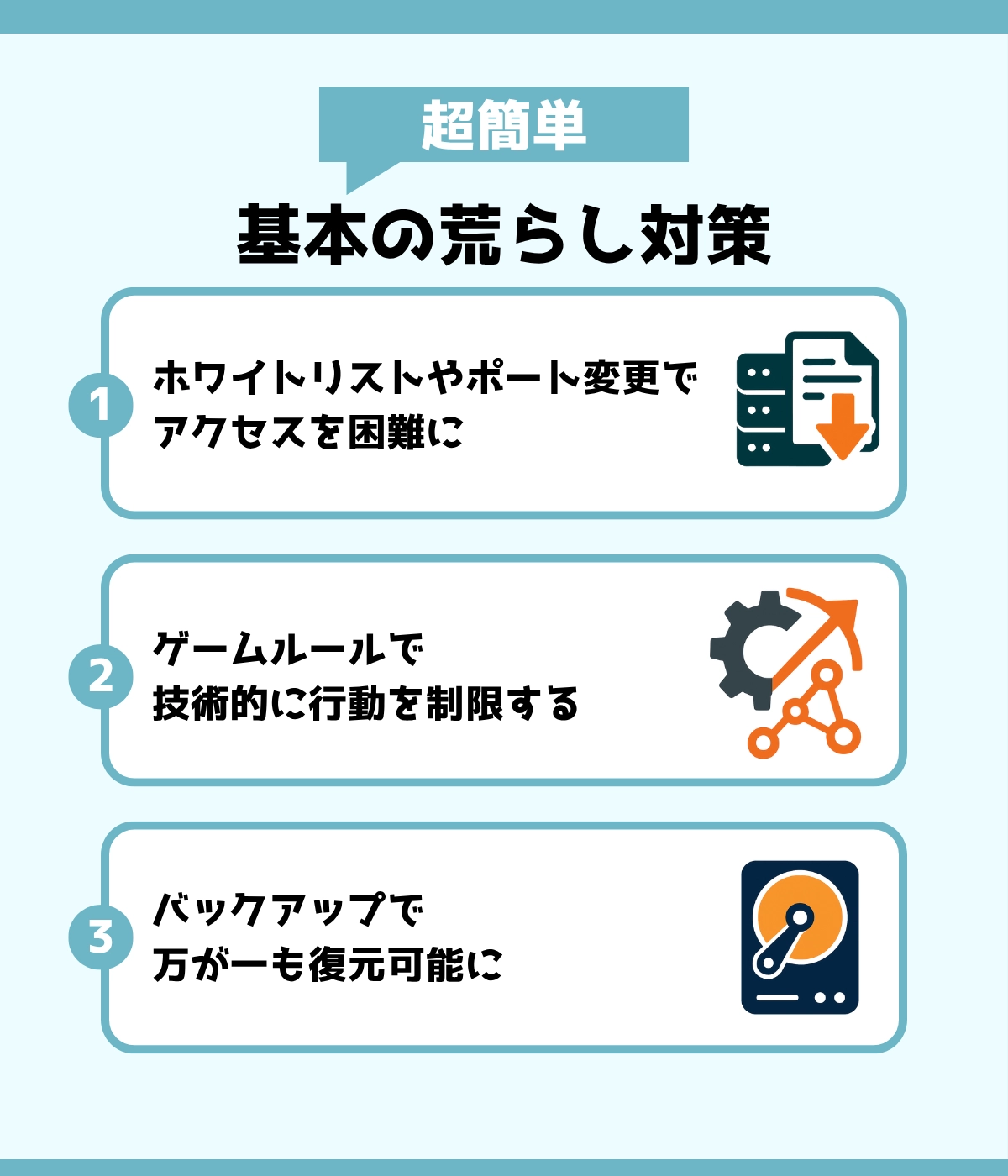 ここでは、サーバー運営初心者でも簡単に導入できる基本的な荒らし対策を紹介します。