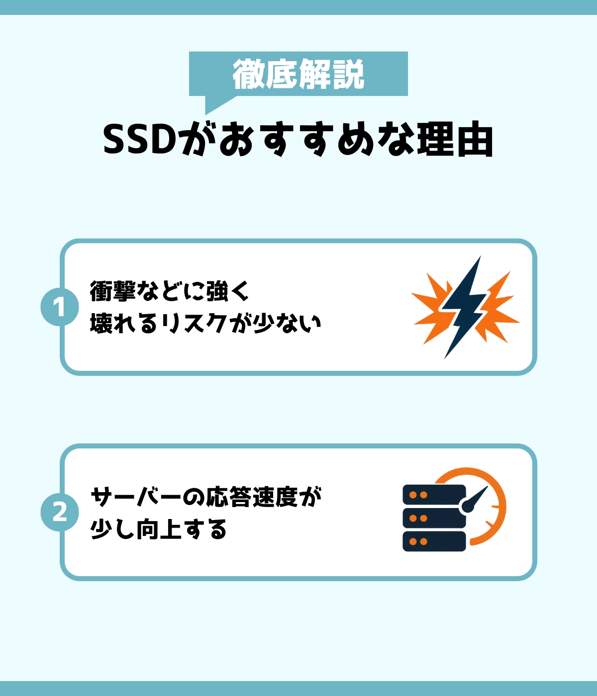 SSDには、サーバー運営において見逃せない大きなメリットが2つあります。